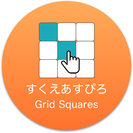 「すくえあすぴろ」は色のついた場所を素早く覚えて、同じ場所をタップするトレーニングです。主に二次元(平面)的な空間認識力と客観力をきたえます。覚えている間の時間をはかり(タイム=スコア)、スコアをあげていきます。
